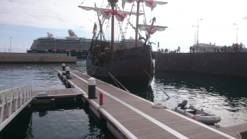 Santa Maria replica (diesel driven) and Cruise Ships at the port