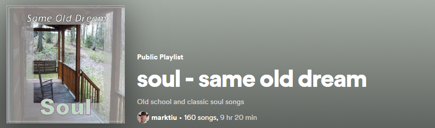 Brook Benton - Rainy night in Georgia 1969 CeeLo - Music To My Soul 2015 Chuck Jackson - Any Day Now 1962 Commodores - Nightshift 1985 Curtis Harding - I Wont Let You Down 2021 Curtis Mayfield and Impressions - People Get Ready 1965 David Ruffin - There Will Always be another Song 1969 Deacon John - Many Rivers to Cross 1970 Diana Ross and Marvin Gaye - You Are Everything 1973 Don Bryant - Is It Over 2020 Dorothy More - Misty Blue 1976 Eddie Holman - hey there lonely girl Eddie Holman - Since I Dont Have You 1969 Edwin Starr - War 1969 Etta James - Id Rather Go Blind 1997 Glenroy Oakley - If There Is Any Justice 2006 Isley Brothers - This Old Heart Of Mine 1965 Jackson 5 - I Want You Back 1969 Jimmy Ruffin - What Becomes of the Broken Hearted 1966 Joan Osbrne - What Becomes of the Broken Hearted 2002 Joe Tex - Hold on to What Youve Got 1965 Johnnie Taylor - Disco Lady 1976 Jr Walker and All Stars - What Does It Take 1969 La Porsha Renae - Stay With Me 2016 Lionel Richie - Do It To Me 2005 Martha and Vandellas - Jimmy Mack 1967 Marvelettes - Please Mr. Postman 1961 Marvin Gaye - I Heard It Through The Grapevine 1969 Marvin Gaye - Sexual Healing 1982 Mavis Staples - Since You Became a Part of My Life 1970 Mckinley Mitchell - I dont know which way to turn 1984 McKinley Mitchell - Same Old Dream 1992 McKinley Mitchell - The End of the Rainbow 1992 Michael Bolton - Sexual Healing 2003 Otis Redding - Fa-Fa-Fa-Fa-Fa Sad Song 1966 Otis Redding - Ive Got Dreams To Remember 1968 Otis Redding - Sitting On The Dock Of The Bay 1967 Patty Labelle & Michael Mcdonald - On My Own 1986 Percy Sledge - Take Time To Know Her 1967 Percy Sledge - Warm And Tender Love 1965 Percy Sledge - When a Man Loves a Woman 1966 Pointer Sisters - Slow Hand 1981 Randy Crawford - Knockin On Heavens Door 1989 Randy Crawford - Rainy Nnight in Georgia 1981 Roy Hamilton - Angelica 1969 Russ Freeman and The Rippingtons - Ill Be Around 2006 Sam and Dave - Soul Man 1967 Sam Cooke - A Change Is Gonna Come 1965 Sam Cooke - Bring it on Home to Me 1962 Sam Cooke - Ease My Troublin Mind 1960 Sam Cooke - Hold On 1961 Sam Cooke - Lovable 1956 Sam Cooke - Only Sixteen 1959 Sam Cooke - Sad Mood 1960 Sam Cooke - Swing Low, Sweet Chariot 1960 Sam Cooke - Wonderful World 1960 Sam Cooke - You Send Me 1957 Seal - A Change Is Gonna Come 2008 Seal - My Girl 2009 Seal - People Get Ready (Live) 2009 Sharon Jones and The Dap Kings - How Long Do I Have to Wait for You 2004 Smokey Robinson - Holly 1976 Smokey Robinson and Miracles - The Love I Saw In You 1967 Smokey Robinson and Miracles - Tracks Of My Tears 1965 Supremes - Baby Love 1964 Supremes - Come See About Me 1965 Supremes - Im Gonna Make Yo Love Me 1968 Supremes - Stop In The Name Love 1965 Supremes - You cant hurry love 1966 Temptations - I Cant Get Next To You 1969 Temptations - Papa Was A Rolling Stone 1972