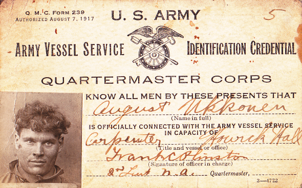 ![]() August oli puuseppänä Army Vessel Servicessä |