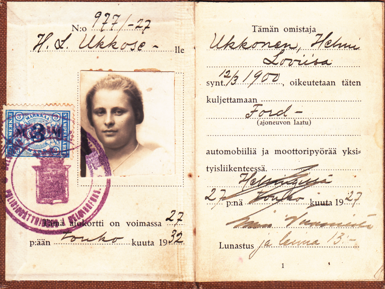 ![]() Tove Blomqvistin äidin äidin Helmi Ukkosen ajokortti (syt. 1900) |